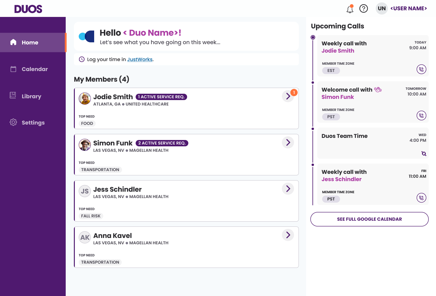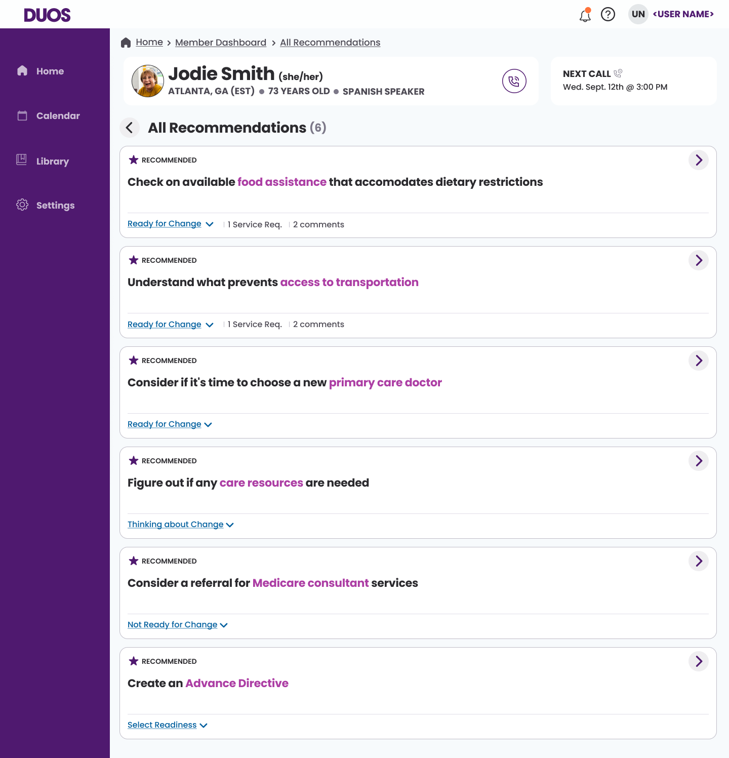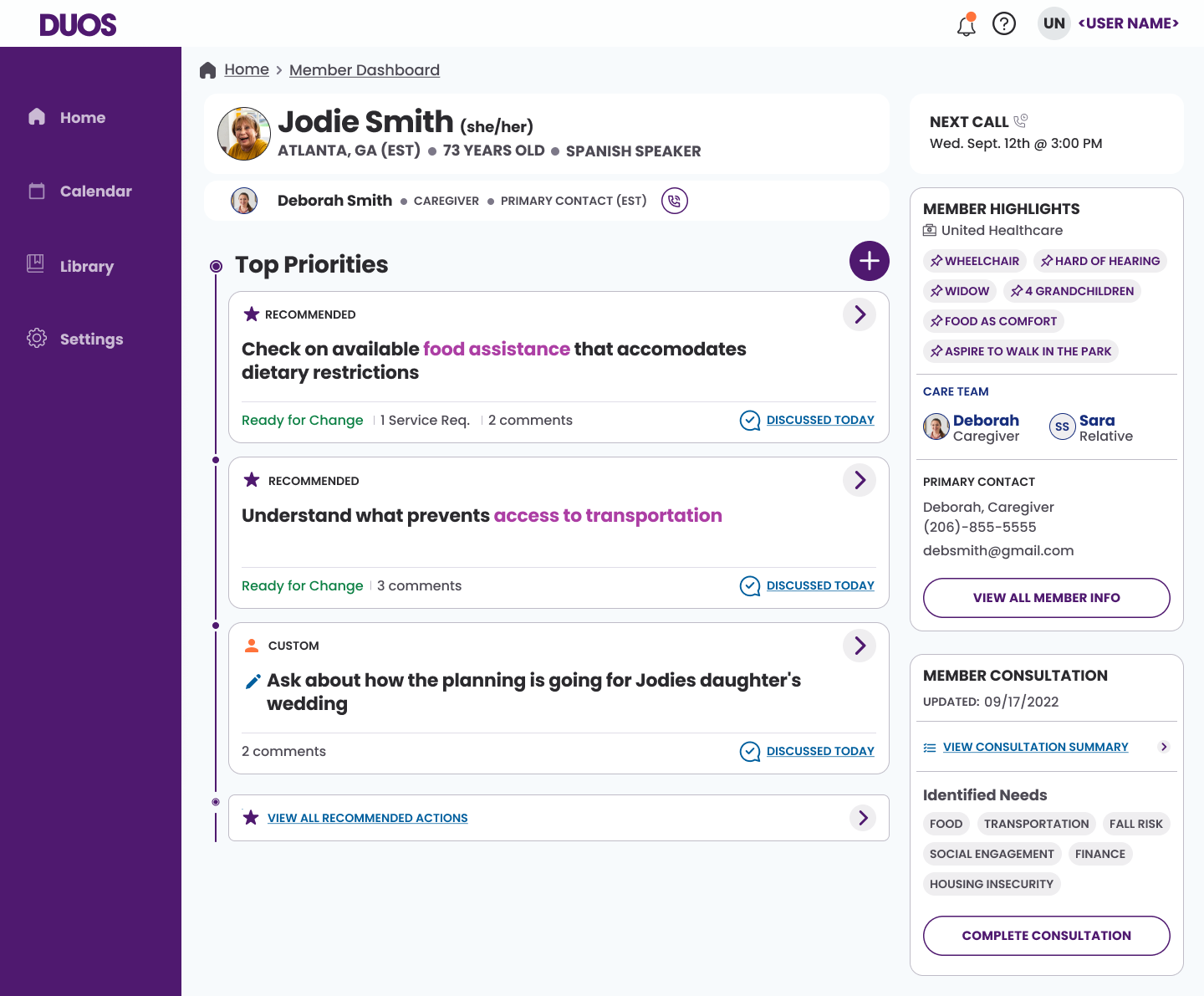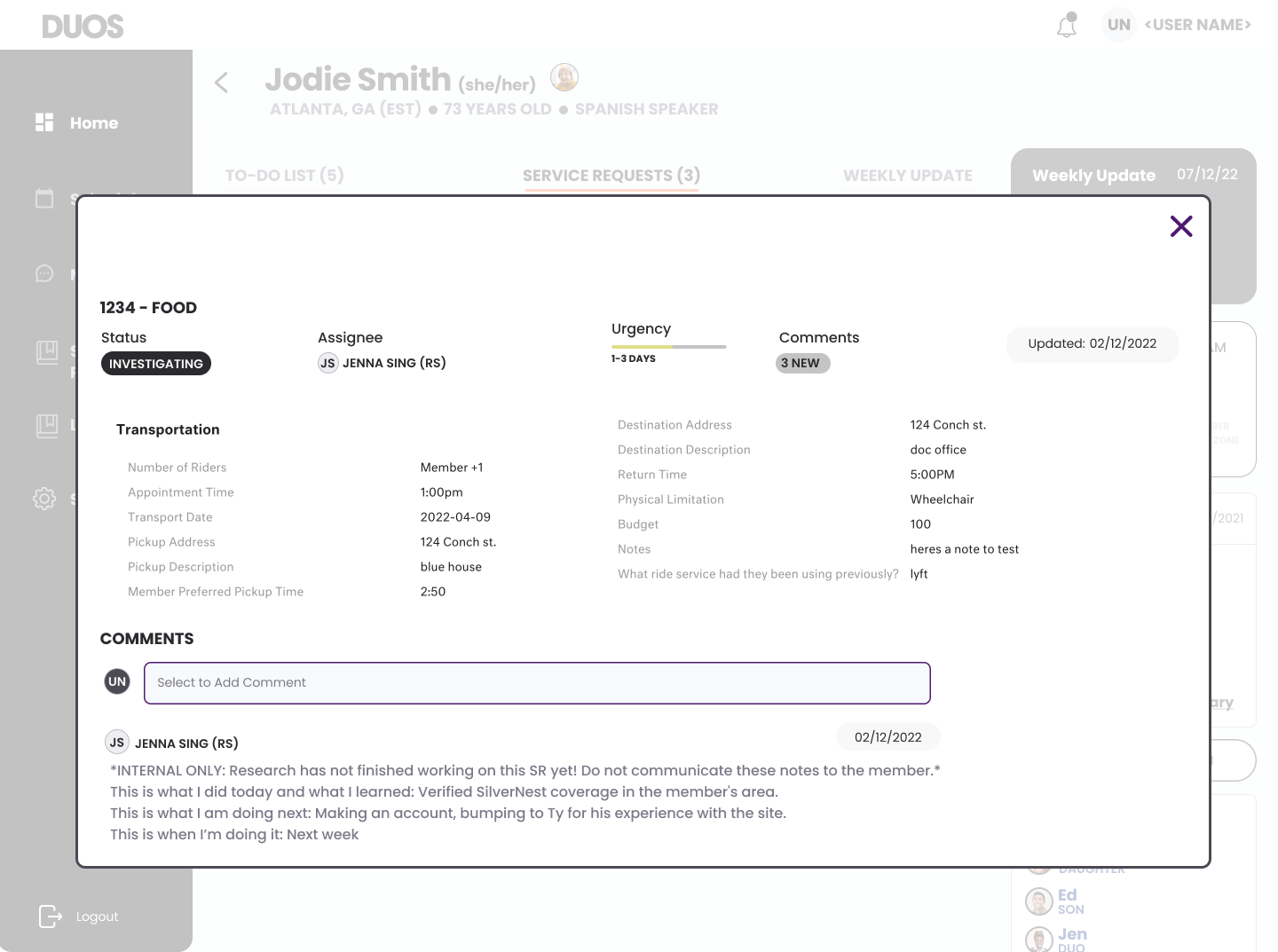 Once members were enrolled with DUOS through our enrollment specialist team and completed an over-the-phone consultation, they were paired with a Duo who called them once a week to help with their social determinants of health (SDOH) needs, also known as their "To-do list". These needs could vary from arranging transportation for doctor appointments, receiving meal deliveries after hospitalization, to finding affordable housing and obtaining durable medical equipment.