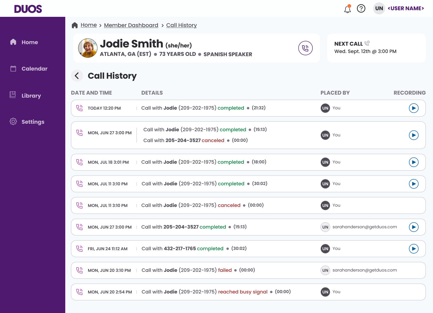 The design demonstrates a member’s call history page. A Duo can listen to call recordings that have taken place with a member.