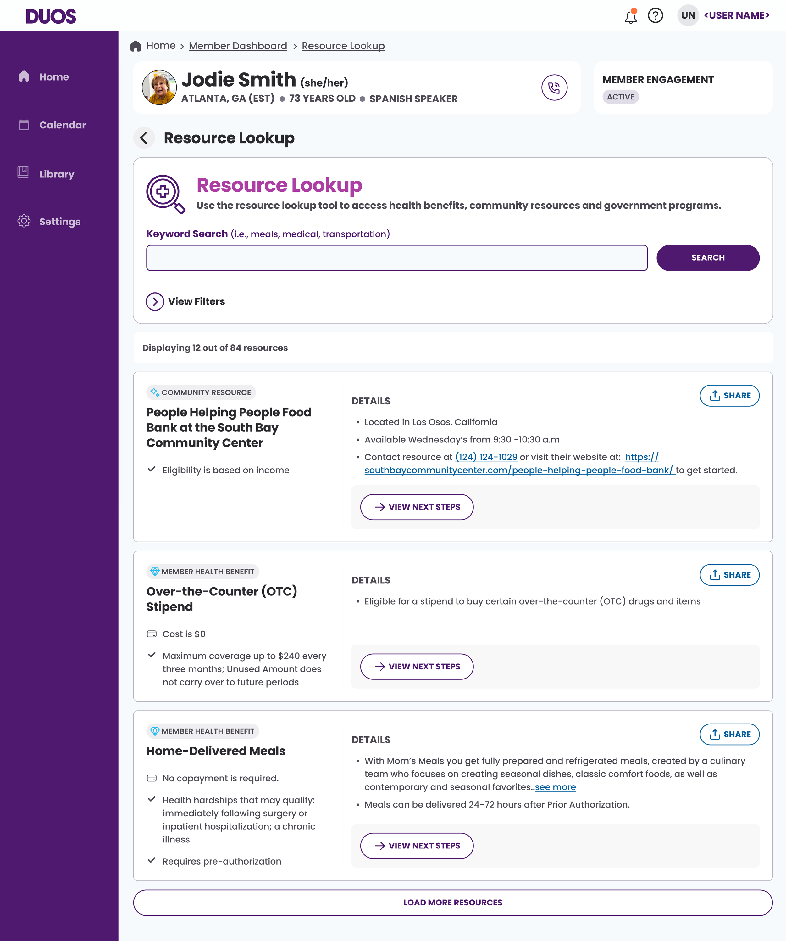 Duos can use the resource look-up feature to find information on their members' health benefits, eligible government programs, and local community resources within their ZIP code. They can then share these resources with members through email.