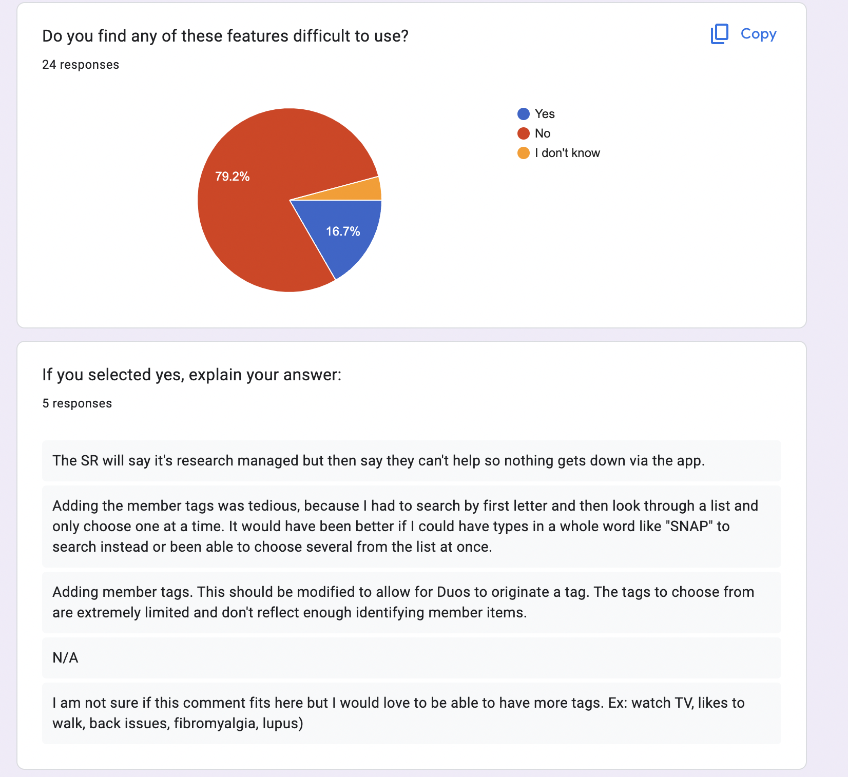 Overall, Duos wanted to spend less admin time and more time speaking to their members. They felt that a lot of their time was wasted by manual input.