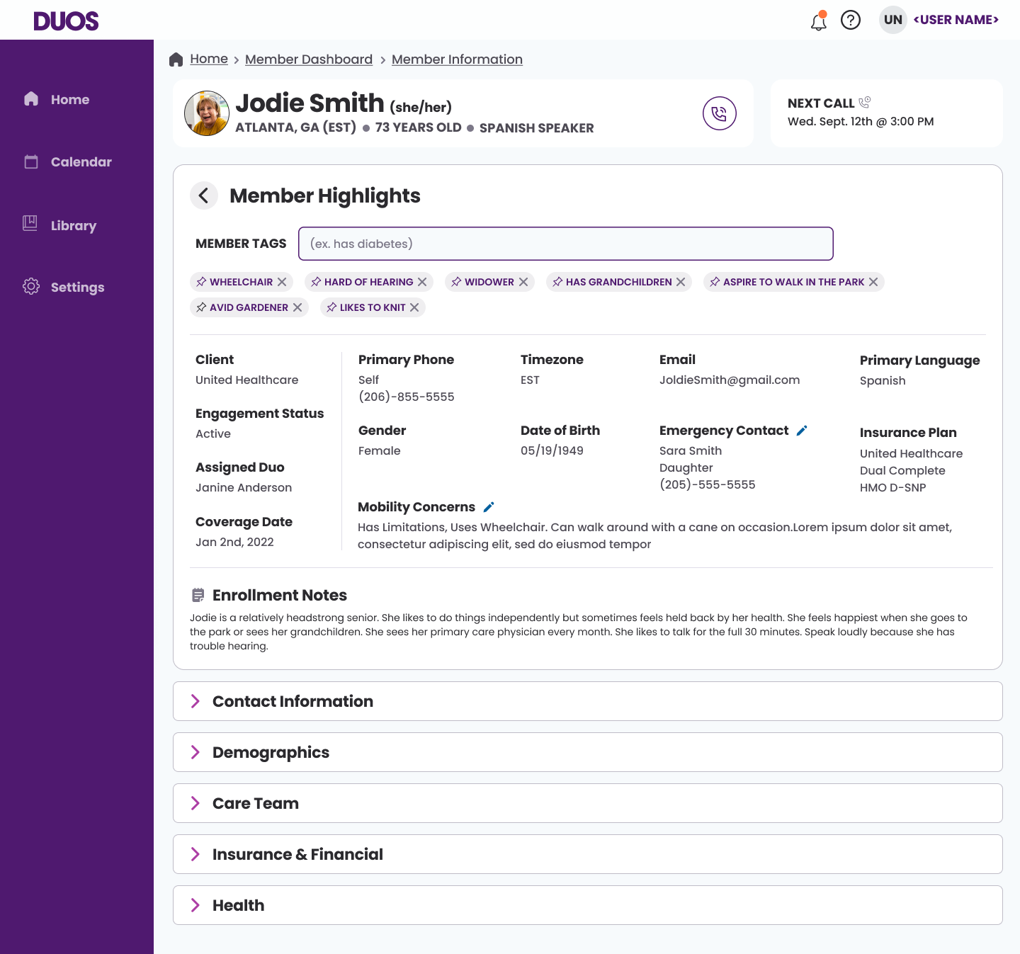 Duos can review their member’s needs, conversation topics, demographic information, and enrollment details in a member's profile.