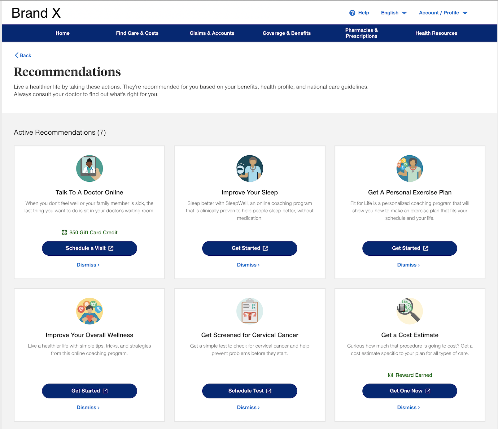 I designed a universal card UI and corresponding dashboard for an "MVP" launch of an AI-recommendation engine. This design satisfied product requirements and branding guidelines across two separate employee health portals.