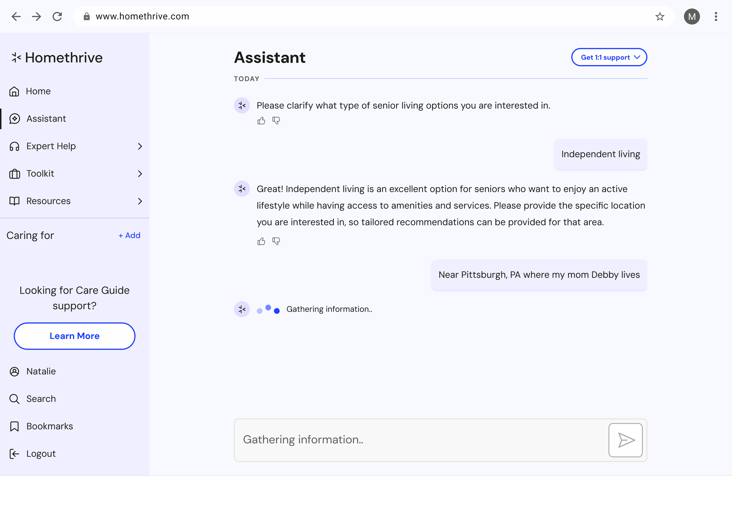 I designed an AI conversational assistant for a responsive web and iOS app to help caregivers locate meaningful information and services about various caregiving needs. The goal was to improve the existing AI’s user experience and increase user engagement and adoption by AI by 10%.